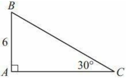 解析:30,60,90 度內角三角形變長特殊比例為:1:√3:2,因此對應 AB 和 AC 長度分別為 6 和 6√3,三角形面積為 18√3,選 D。