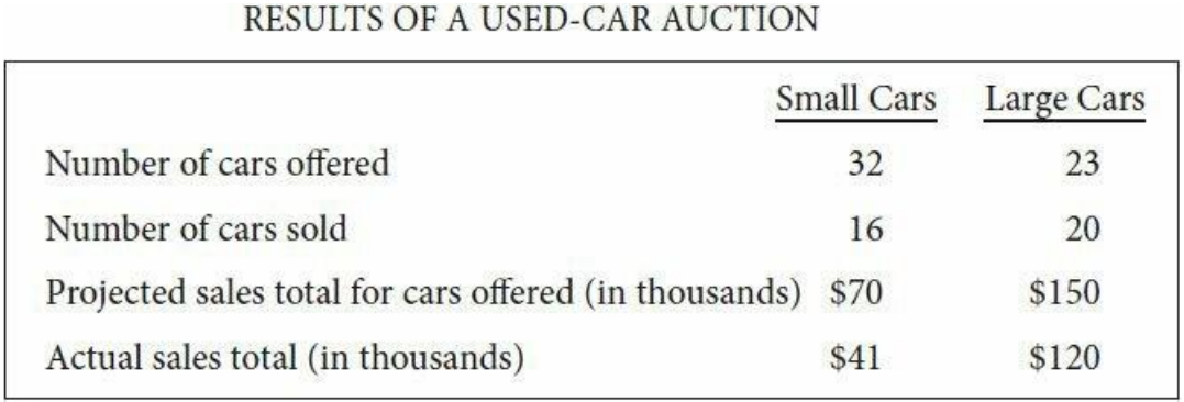 For the large cars sold at an auction that is summarized in the table above,what was the average sale price per car?