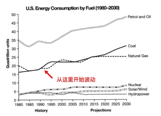 譯:(煤和天然氣的)消耗量從1990年起有所波動,但是兩者現在都提供24q。