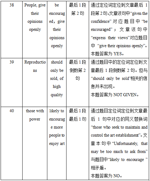 本題型可先看題目,將其中關(guān)鍵詞劃出,回文章查找。如果關(guān)鍵詞只是同義替換邏輯未變,則答案為YES;如果關(guān)鍵詞中有一個(gè)性質(zhì)錯(cuò)誤或者意義相反,則答案為NO;如果有一個(gè)關(guān)鍵詞缺失,則答案為NOT GIVEN。