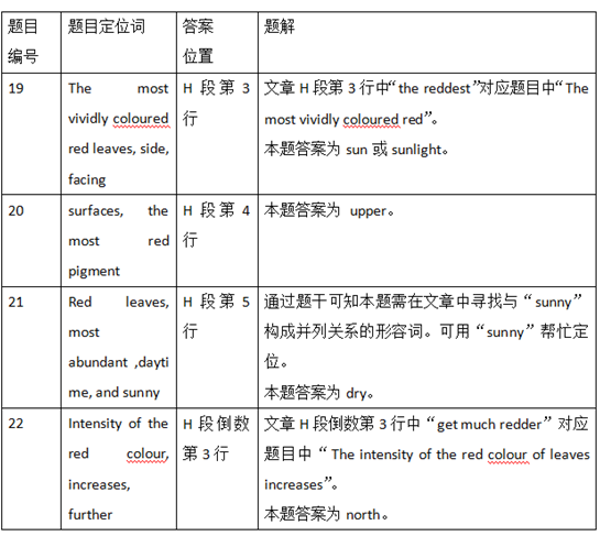 19.The most vividly coloured red leaves, side, facingH段第3行文章H段第3行中“the reddest”對應(yīng)題目中“The most vividly coloured red”。