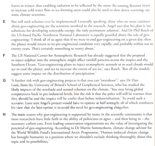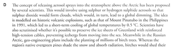 參考翻譯:大部分“地球工程”項目至今已實施,包括在沙漠種植森林和在海洋沉淀鐵物質去刺激海藻的增長,這些都達到使地球冷卻的效果。