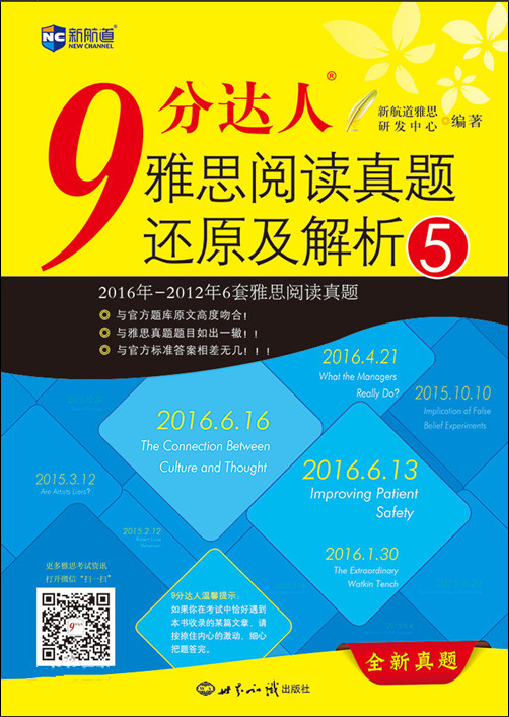 《9分達人雅思閱讀5》收錄了2016年-2012年6套全新閱讀真題,與官方題庫原文高度吻合,與所考題目如出一轍,與標準答案所差無幾。相比《劍1》—《11》所收錄的那些劍橋雅思考試委員會早已棄之不用的老題或舊題,《9分閱讀5》無疑成為了“烤鴨”備考資料!