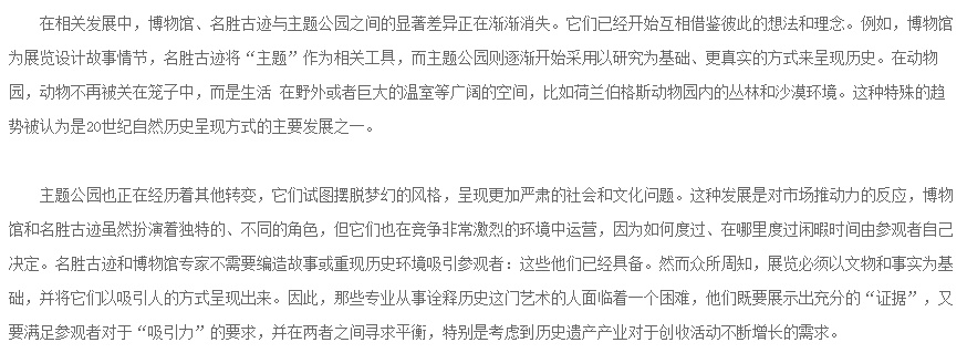 然而近來,人們對(duì)歷史及其呈現(xiàn)方式的態(tài)度有所改變。如今,遺產(chǎn)展覽的關(guān)鍵詞是“體驗(yàn)”,而且越刺激越好,如果可能,還要觸動(dòng)各種感官。在英國(guó),約克的約維克中心,布拉德福德的國(guó)家攝影、電影和電視博物館,以及倫敦的帝國(guó)戰(zhàn)爭(zhēng)博物館是運(yùn)用該方式的成功例子。在美國(guó),這種趨勢(shì)出現(xiàn)得更早,一直以來威廉斯堡都是世界其他地區(qū)遺產(chǎn)發(fā)展的典范。無人可以預(yù)知這樣的趨勢(shì)何時(shí)會(huì)結(jié)束。在所謂的遺產(chǎn)地,歷史事件重演越來越受到人們的歡迎,而不久之后,電腦將提供虛擬的現(xiàn)實(shí)體驗(yàn),參觀者選定一個(gè)時(shí)期,該時(shí)期的生動(dòng)畫面就會(huì)呈現(xiàn)出來,參觀者身臨其境,仿佛自己處在當(dāng)時(shí)的歷史環(huán)境中。有人批評(píng)這一方式,認(rèn)為這種粗俗化的呈現(xiàn)方式無法接受。但許多歷史主題公園和類似景點(diǎn)的成功表明,大多數(shù)公眾并不認(rèn)同這一觀點(diǎn)。
