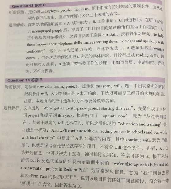 題目解析:首先我們聽到“The feedback was very positive”,體現了題干中參與者的評價useful,可定位題目。接下來聽到的幾個形容詞“encouraging、confident”都是褒義詞,體現了“...using social media to keep in touch with their grandchildren”這項活動是有用的,其中keep in touch with 對應B選項的communicating with;grandchildren對應family,因此可選B;之后出現了“prefer...to..."這個句型,prefer后面的信息是被肯定的,但是to后面是被否定的東西,因此容易出現干擾項,通過“prefer this form of communication to phoning or sending emails”可將E選項排除;之后聽到“A lot of them also said”中的also表示進入下一個觀點,即“playing online games would help them make new friends and keep their brains active”,其中help這個動詞可以表明玩在線游戲是有用的,因此可選D。接下來的“They weren't that...order their groceries online”表示他們并不是很喜歡網購,由此可排除C選項;最后提及了A選項的tablets,但是“they asked about”,表明老人們并沒有學習,只是詢問了一下,緊接著的“we'll make sure we include this time"也表示將會在這次加入這個內容,而非已經學過的東西,因此A可排除。