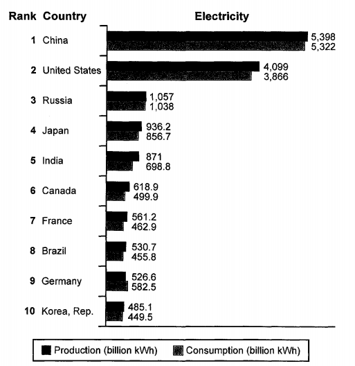 The bar chart shows the top ten countries that generated and used electricity in 2014 measured in billions of Kilo Watt hours(bkWh). The countries are China, the US, Russia, Japan, Indianada, France, Brazil, Germany and the Republic of Korea.