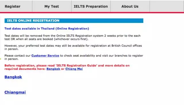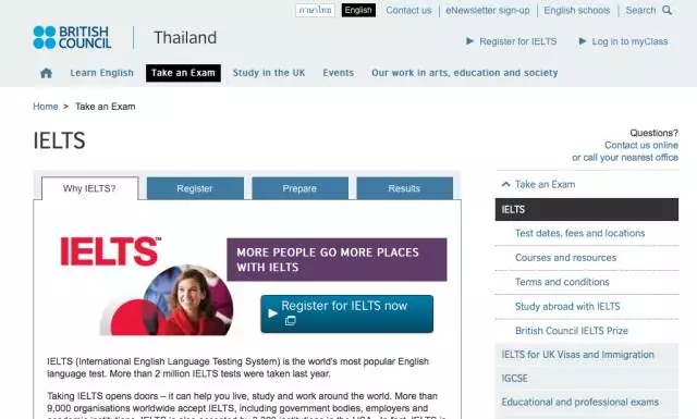 點擊泰國的雅思官網網址:http://www.britishcouncil.or.th/exam/ielts ,進入雅思泰國報名頁面。報名的網址千萬別找錯!記得選擇英文版, 如果你懂泰文,那請點擊泰文版!