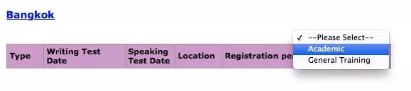 我這里點了曼谷Bangkok右邊出現選項,選擇Academic學術類還是General Training移民類,之后就會出現下面這張圖。注意一定要看好日期,dd/mm/yy,有可能口語和筆試時間不是一天,不過大多數都是一天。
