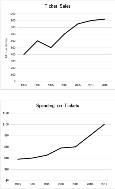 In the first graph, ticket sales were 400 million dollars in 1985. After that, the number increased noticeably to 600 million in 1990 but had dropped to 500 million by 1995. From that year onwards, there was a jump of more than $400 million dollars in the sales of tickets, reaching around 900 million in 2015 although the rise slowed over the last ten years.
