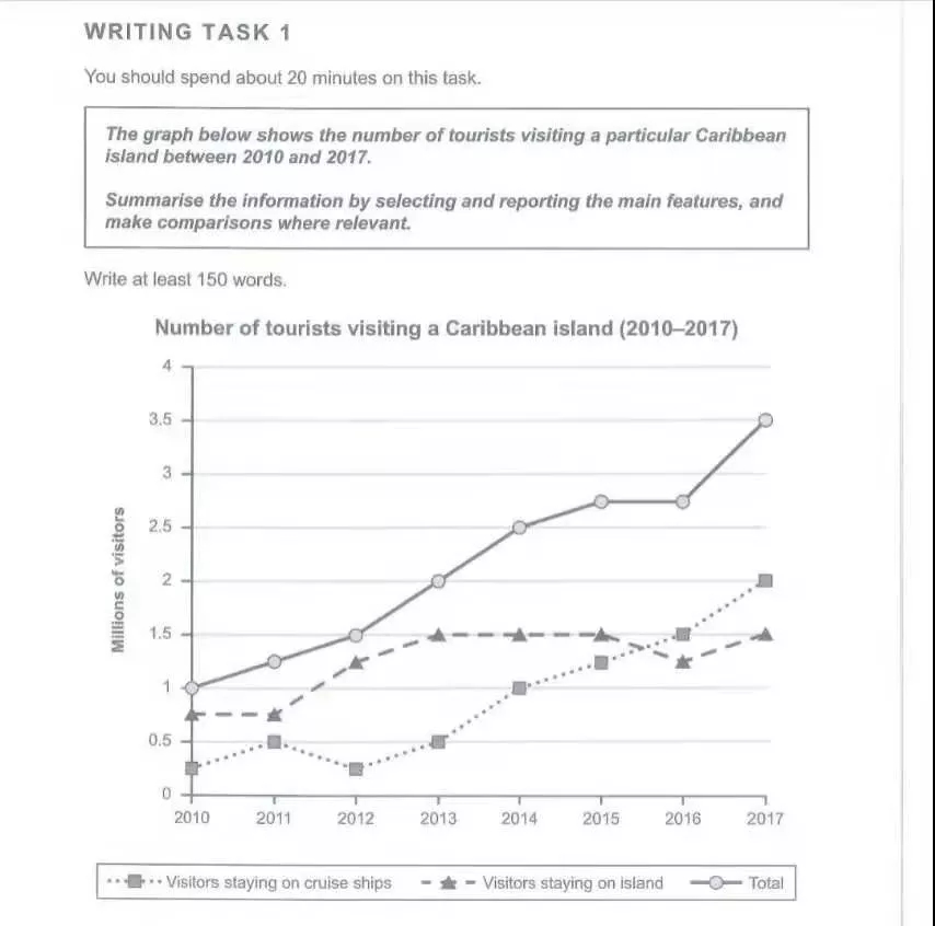 第一句話說明圖的大意:Shown in the graph are three lines that respectively depict the total number of tourists visiting a Caribbean island, as well as the specific numbers of two particular types of tourists. 第一句話中注意下劃線部分是引起了一個倒裝句(主語和系動詞位置顛倒的倒裝),這種倒裝結構可以當成模板套用。The general view of those numbers is that they all had evident overall growth. 第二句話說明圖的最宏觀最直觀的特點。