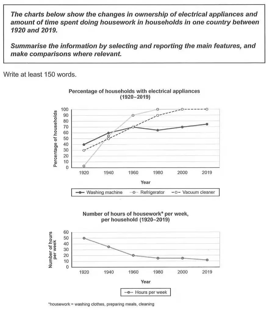 第一句話說明圖的大意:The two graphs respectively depict a country’s changing ownership of three home appliances since 1920 and the time a household spends on doing household chores during the same period.第二句話說明圖的最宏觀最直觀的特點:Overall, both the increasing ownership and the decreasing time are evident.