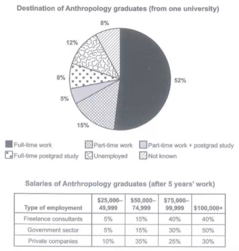 第一句話說明圖的大意:Shown in the chart are the employment choices of Anthropology graduates from one particular university,這前半句話中注意下劃線部分是引起了一個倒裝句(主語和系動詞位置顛倒的倒裝),這種倒裝結構可以當成模板套用。注意:系動詞的單復數由后面名詞的單復數決定,并不就是are。同時注意:柱、餅圖慣用bar,線圖慣用graph。and the table sorts those graduates by three types of employment and by four ranges of salary. Overall, there is conspicuous disparity in terms of both the choices and the salaries.第二句話說明圖的最宏觀最直觀的特點。