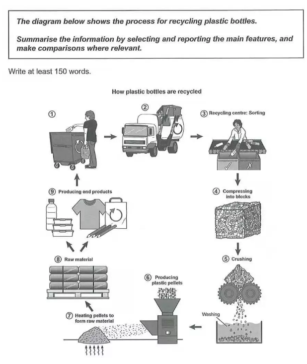Shown in the diagram is the procedure of recycling plastic bottles. Overall, the process is moderately complex, consisting of a number of steps. 第一句劃線部分是一個倒裝形式,當成套話記住。提醒注意:動詞的單復數由后面的內容決定。第二句話陳述圖的宏觀情況。通常說來,就是說一下這個流程的復雜程度。