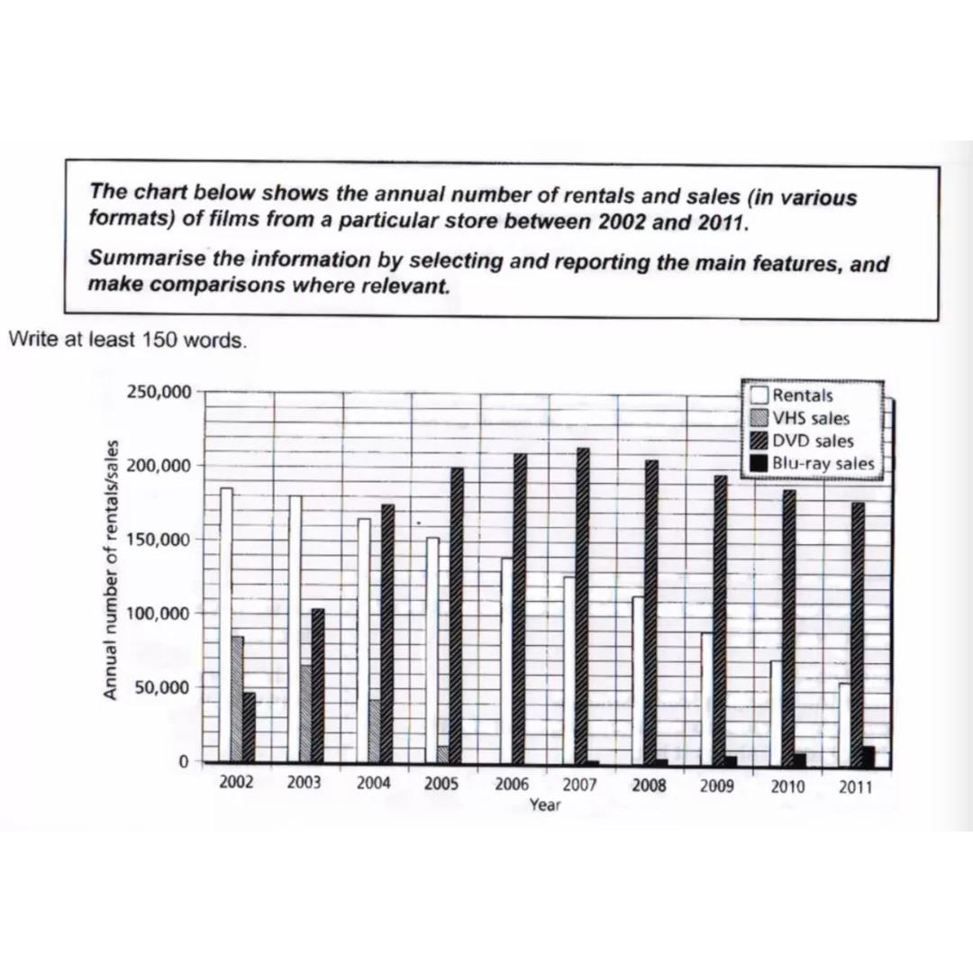 Shown in the chart are a particular store’s annual numbers of rentals and sales of films in three formats. And the investigated period spans from 2002 to 2011.