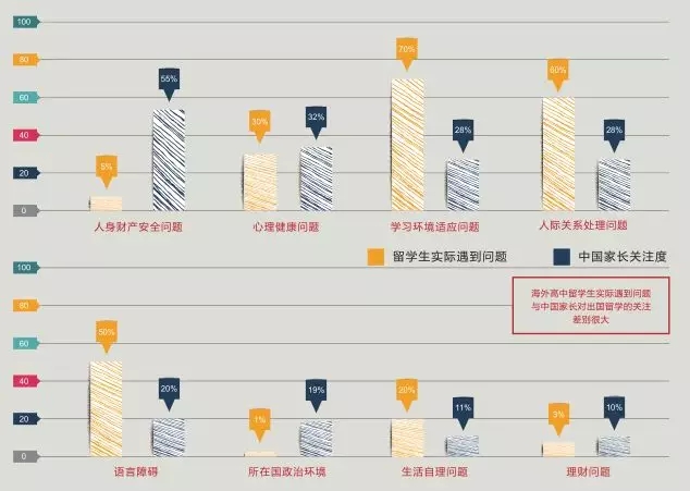 對(duì)此,我們?cè)鲞^(guò)一個(gè)關(guān)于“海外高中留學(xué)生實(shí)際遇到問(wèn)題與中國(guó)家長(zhǎng)對(duì)出國(guó)留學(xué)的關(guān)注差別”的調(diào)查,調(diào)查發(fā)現(xiàn),孩子焦慮的、家長(zhǎng)關(guān)心的,往往與實(shí)際遇到的問(wèn)題差別很大。