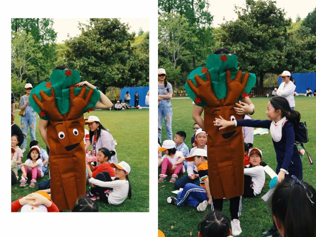在小組長的帶領下,每個小組給出八張卡,上面是需要尋找的樹的部位。小朋友根據樹的部位,比如bark,branch,trunk,crown,leaf,flower去找相對應的樹和老師事先埋在樹下的卡片,并把樹的中文名字寫在卡片后面,看哪組在規定的時間內找到最多的卡片。