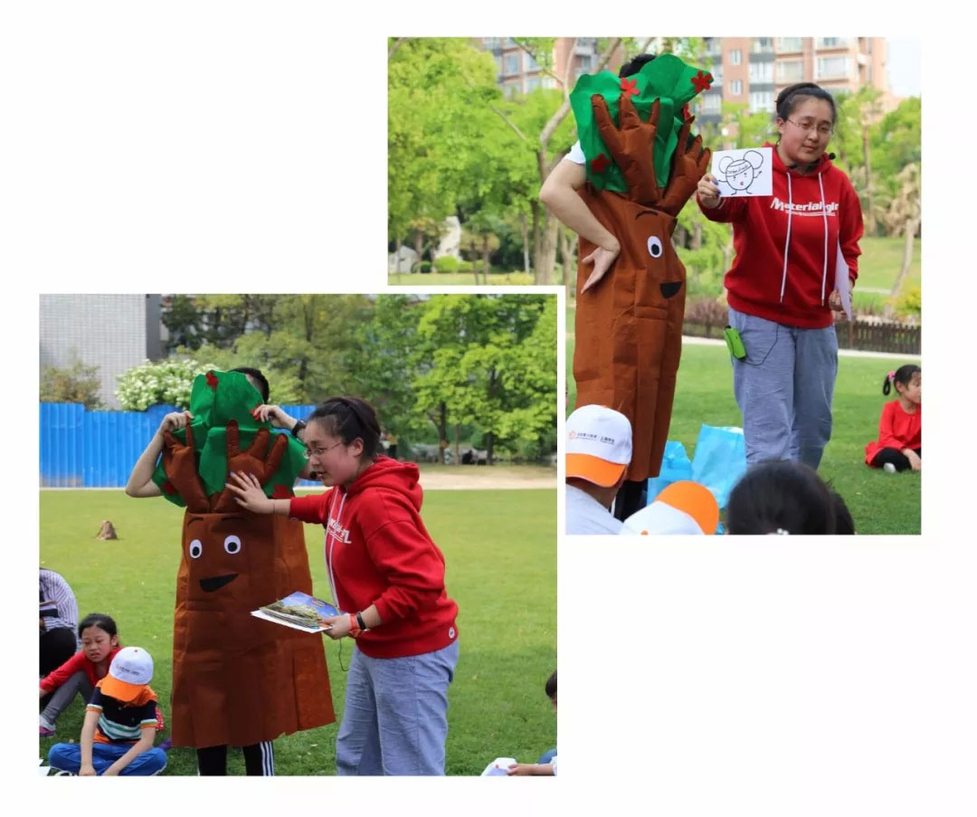 主講老師用生動的語言講解了呼吸作用,碳循環和光合作用。主講老師做人,扮演大樹的老師做植物(代表兩個種族),然后用給出和接受等肢體語言講氧氣和二氧化碳的循環。孩子們在玩中學,在學中玩。