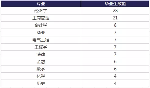 最受未來CEO們歡迎的學位是經濟學,共計28人選擇了這門專業。第二受歡迎的科目是工商管理,有21位CEO研究過該門課程。其他受歡迎的科目還有會計學(8人)、商業(7人)、電氣工程(7人)、工程學(7人)、法律(7人)、金融(6人)、數學(6人)、化學(4人)和歷史(4人)。