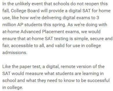 如果秋天學校仍然沒有開放,CB會考慮推出“家庭版SAT考試”,就像AP遠程考試一樣,CB確保SAT遠程考試安全、有效,能申請美國大學。