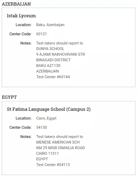 國際考場:阿塞拜疆3個,埃及1個,英國1個,埃塞俄比亞1個
